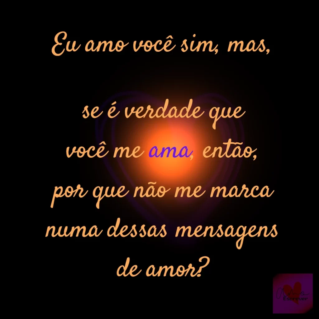 Eu amo você sim, mas, se é verdade que você me ama, então, por que não me marca numa dessas mensagens de amor?Se não quer que o mundo saiba, é porque há algo de errado. Ou você mente, ou tem algo a esconder.Assuma que me ama, ou suma!CompartilharMarcações:amo escreveramo escrever siteamoescreverassuma ou sumainstafrasesmensagens para instagramDeixe um comentário Cancelar respostaO seu endereço de e-mail não será publicado. Campos obrigatórios são marcados com *Nome * E-mail * Site Comentário * Salvar meus dados neste navegador para a próxima vez que eu comentar. Δ